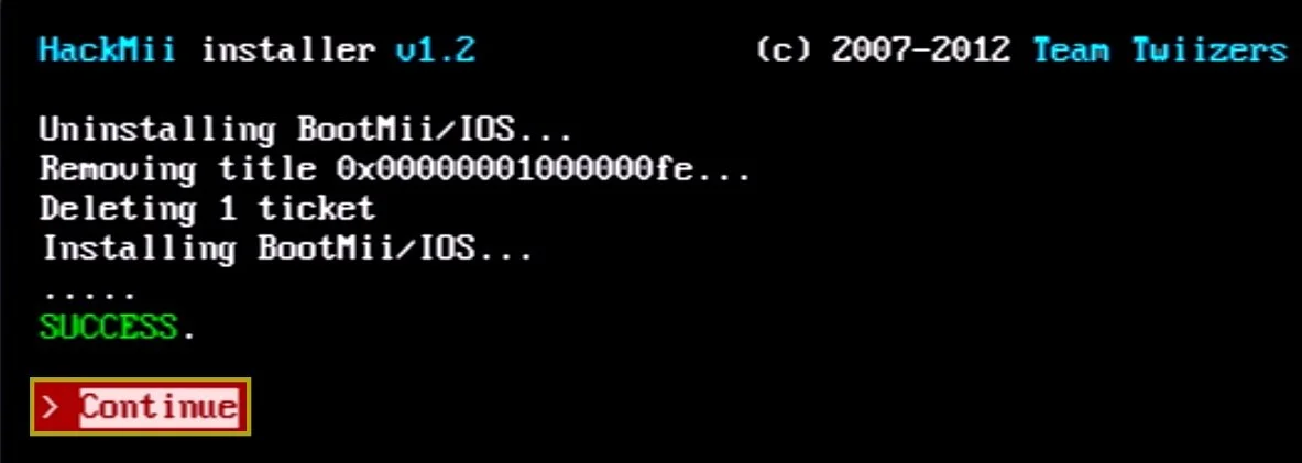 Great, you made it to the hackmii installer page. This section will allow you to install homebrew channel, which is our main goal. It will also allow you to install bootmii, which is a critical piece of software for brick protection, or protection from the console becoming permanently unusable. Once at the hackmii installer page, wait 30 seconds for the “press 1 to continue” prompt to appear and press 1.