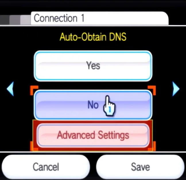 Press the right arrow 3 times until you get to Auto Obtain DNS and select No