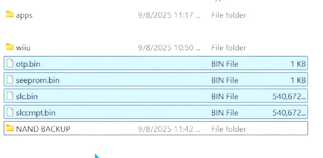 Once the backup is complete, power off your Wii U and take your SD card out. Plug the SD card into your PC. You should see a bunch of files that say mlc.binpart01 02 03 if you backed up your MLC. You’ll also see seeprom, otp.bin, slc.bin, keys.bin and more. These are all backups of your NAND. Create a folder on your SD card called NAND Backup (if it is not already there). Now drag all these NAND backup files into the folder.