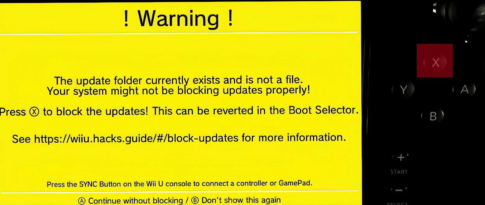 You may get a warning message about the update folder existing. This is normal. Press the X button to block updates. Don’t worry if you don’t see it though.