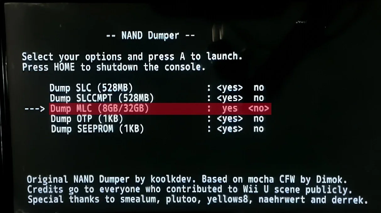 The Wii U has 2 versions of internal storage or NAND size, which is 32GB or 8GB depending on your Wii U model. As a result of this, to create a full backup of your console’s NAND, your SD card has to be larger than the size of your NAND. If you do not have a large enough SD card, you can skip the optional MLC backup section which includes save files and game data which is not needed to recover any type of console issue. In NANDdumper, make sure everything shows YES, unless you don’t want to backup the MLC.