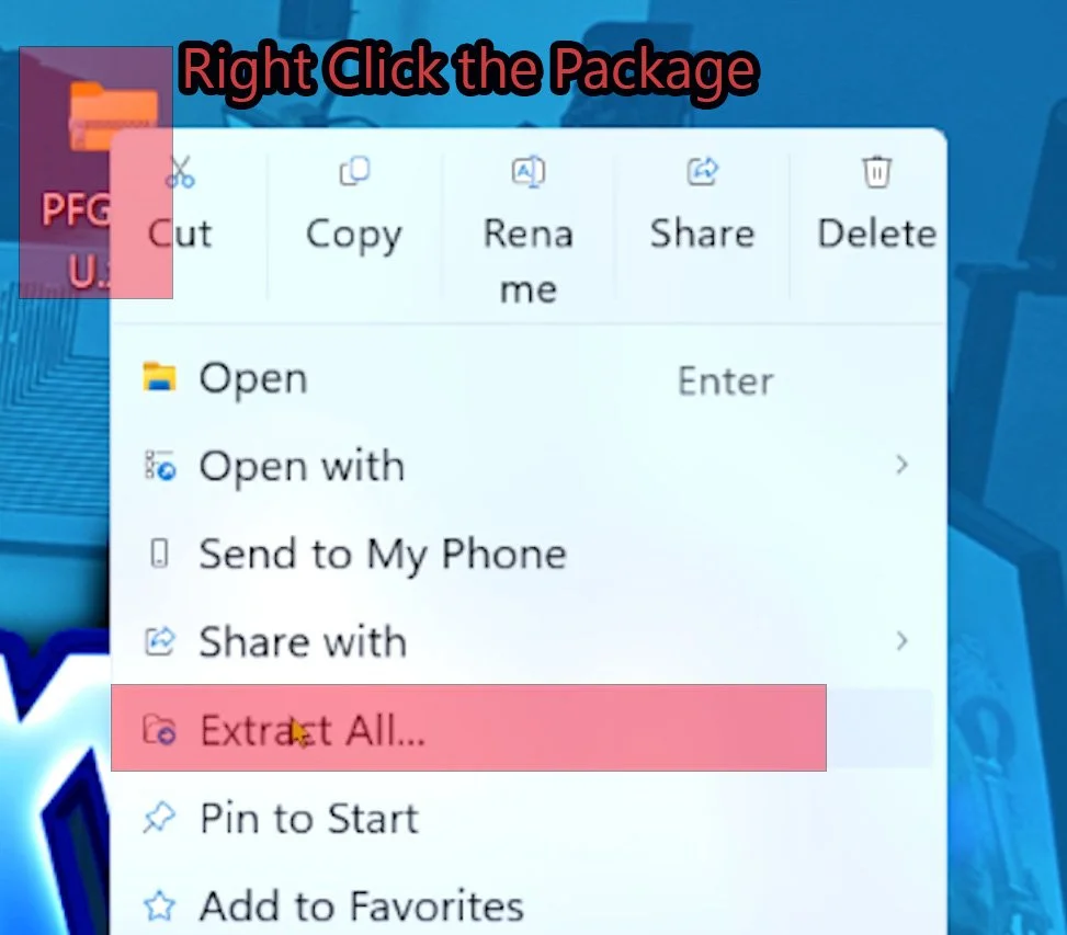 Your SD card is setup and ready for the SD card files transfer. Right click on the PFG Wii U 2026 package and press extract all. This will bring you to another option to extract