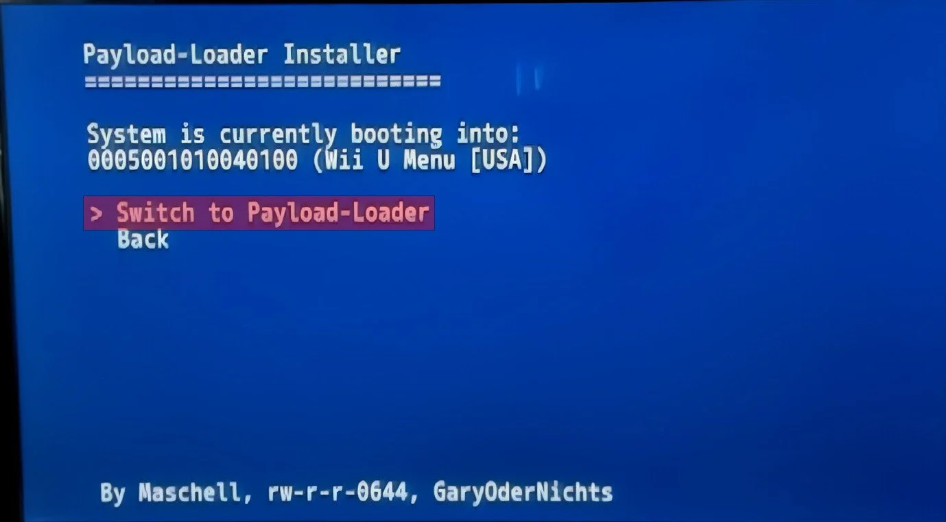 Now that your NAND is backed up in case anything goes wrong later, we can continue with the guide by installing the payload-loader onto the Wii U. Installing this payload-loader will allow us to install Aroma, which is the custom firmware that will allow homebrew apps. Payload-loader acts as a bridge that allows you to bypass some of the Wii U’s standard security and boot processes so that Aroma can be injected into the console.